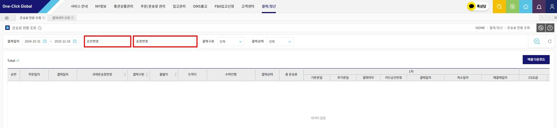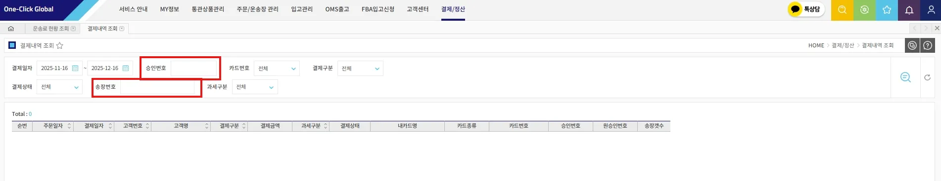 2. ๊ฒฐ์ /์ ์ฐ ํญ > ๊ฒฐ์ ๋ด์ญ ์กฐํ