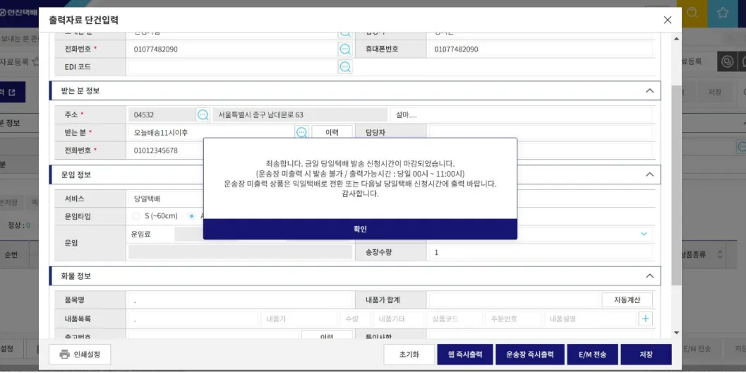 (11시~24시는 신청 불가 / 일반 택배로 전환 필요)
